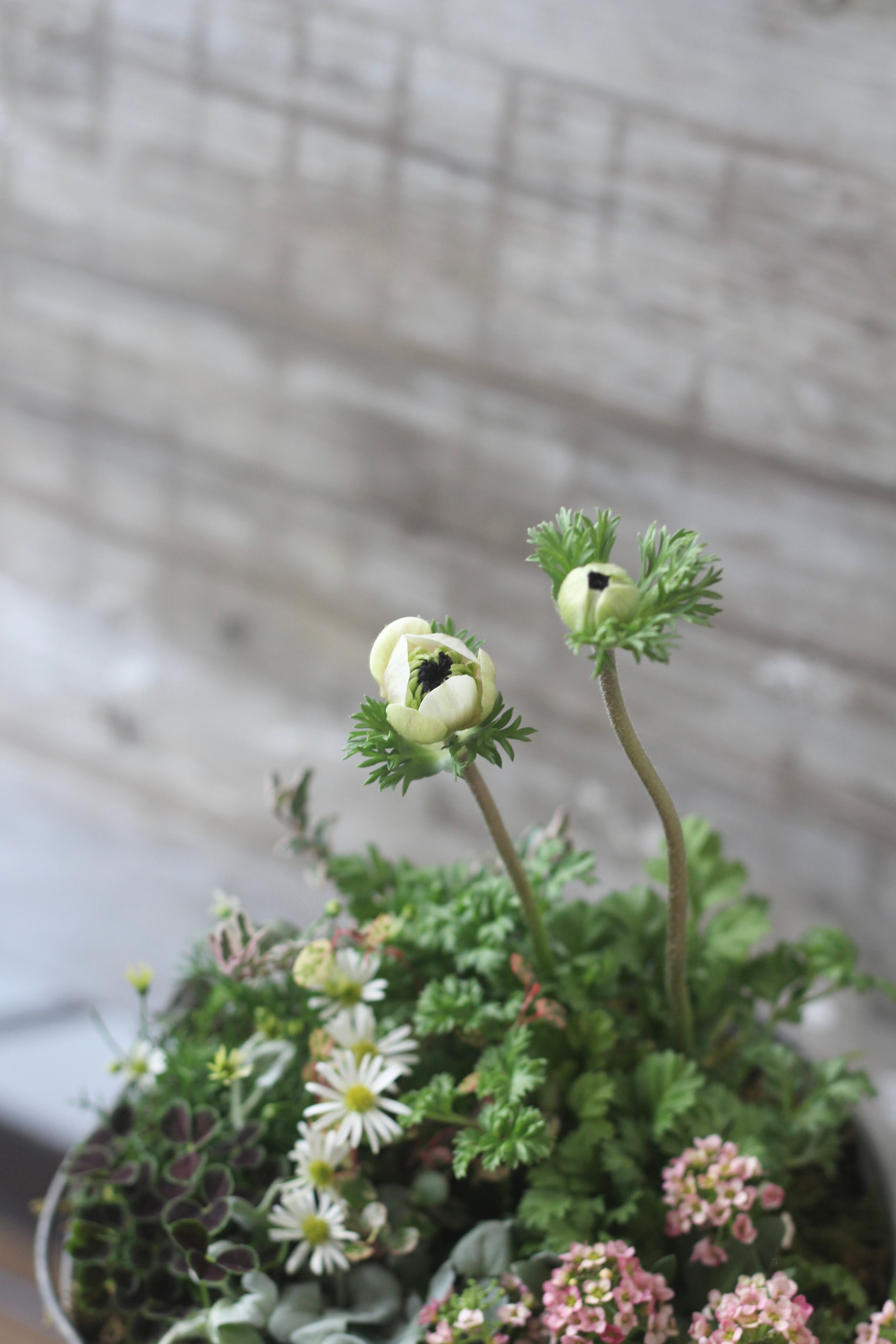 何色が咲くか楽しみなアネモネ、カモミールのようなお花が咲いて可愛らしいブラキカム、四葉を探してみてほしいクローバー、など7種類をブリキ鉢に植え込みました。