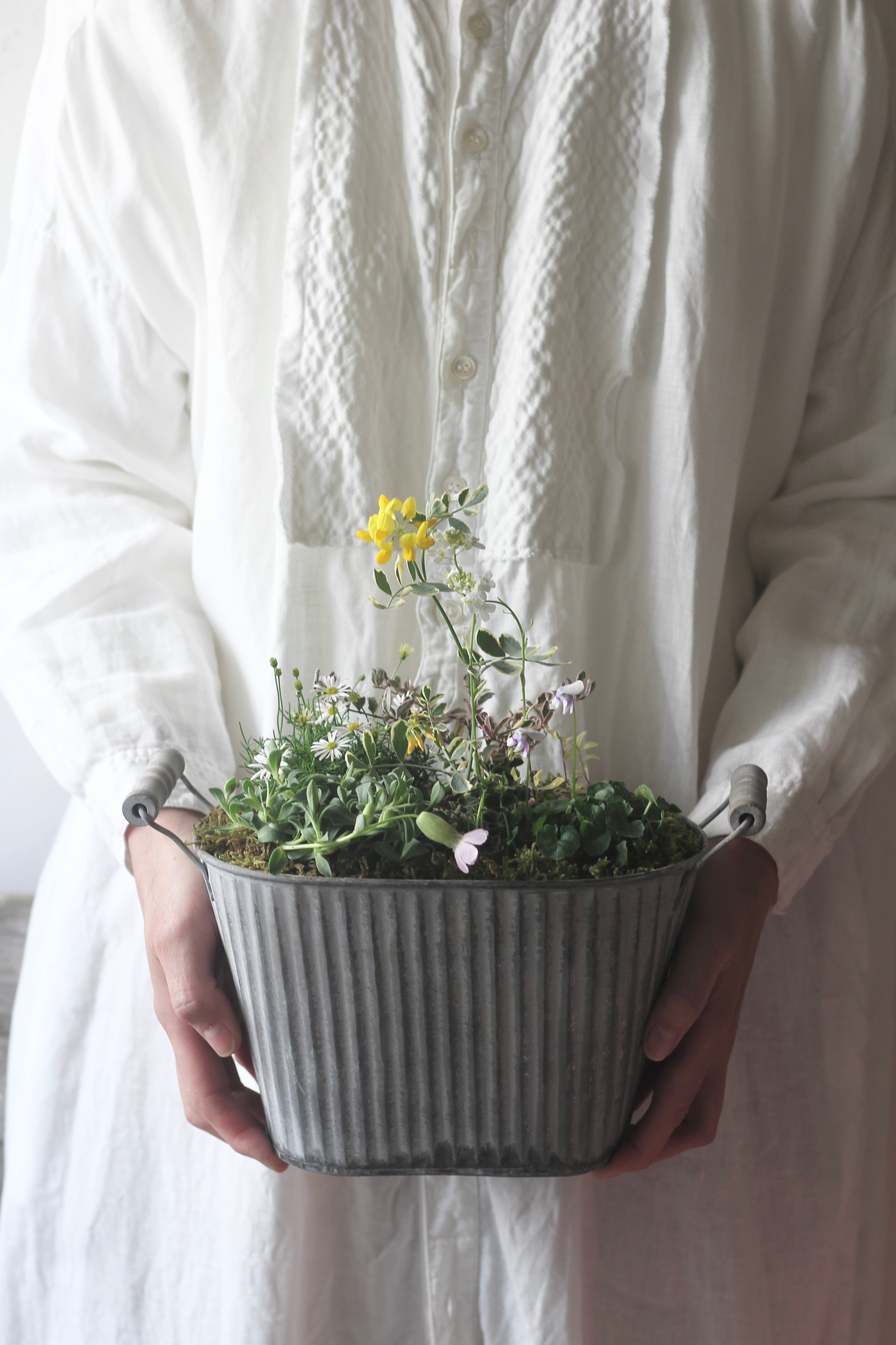 カモミールようなお花が咲くブラキカム、パンダスミレなど、7種類の植物をブリキ鉢に植え込みました。