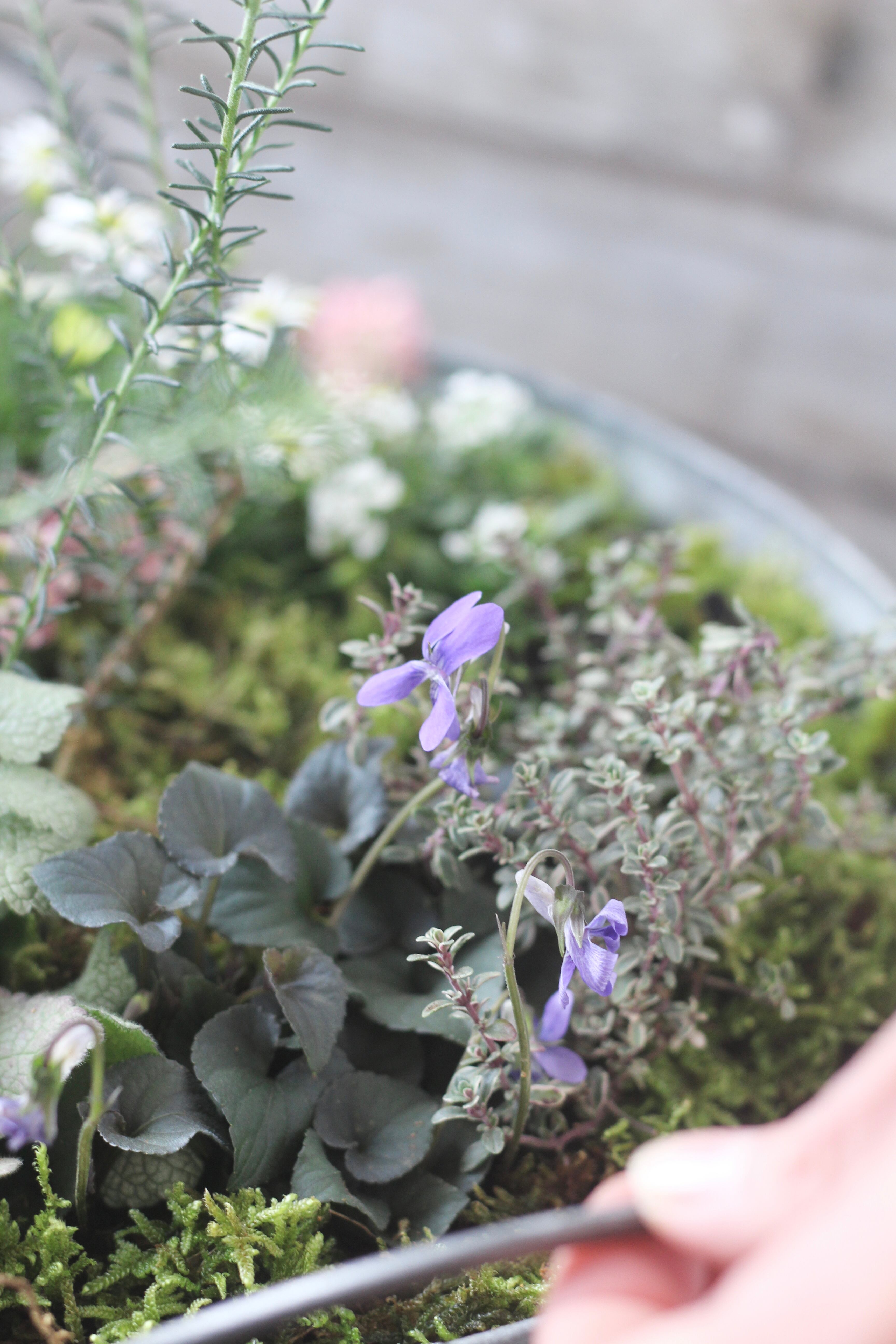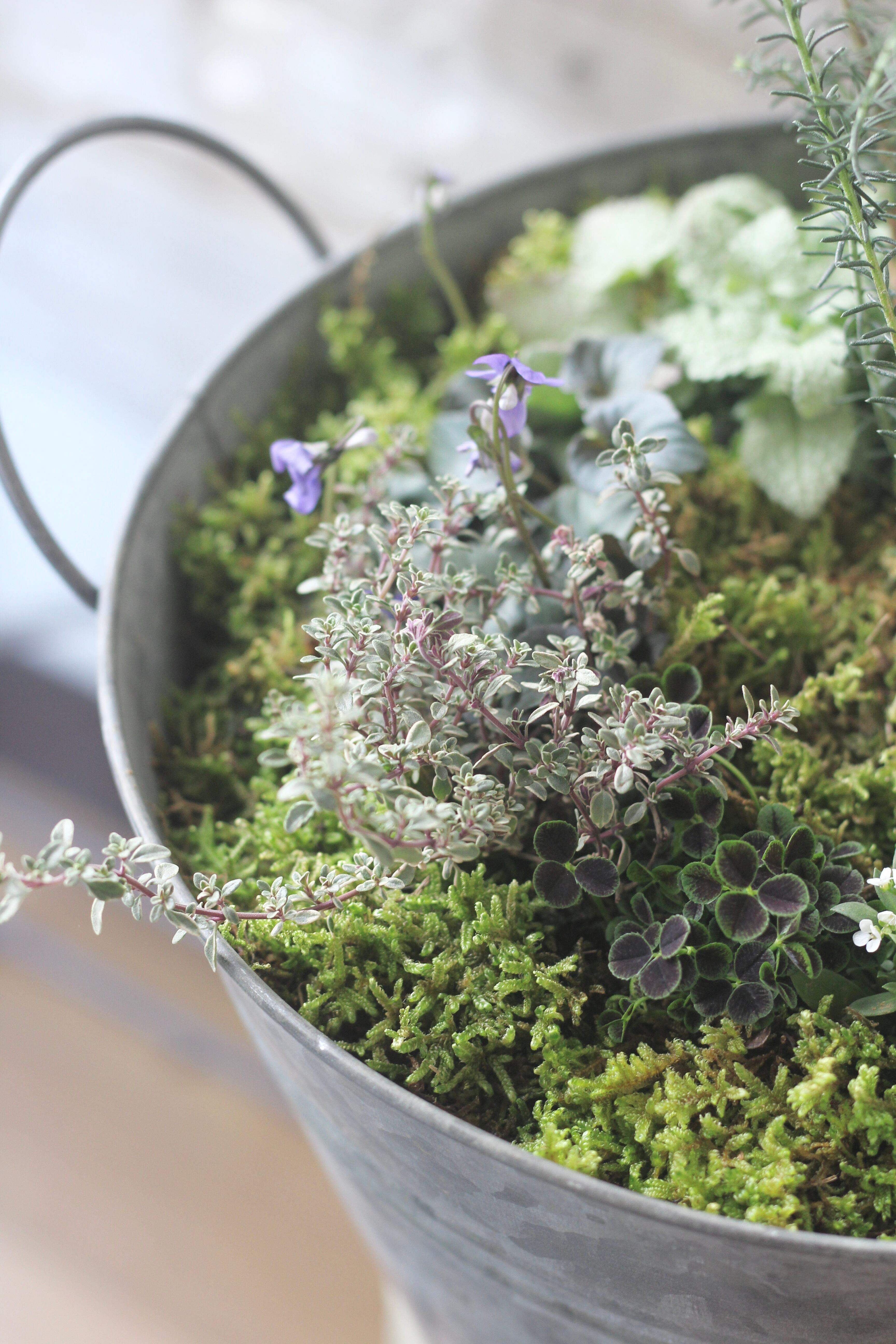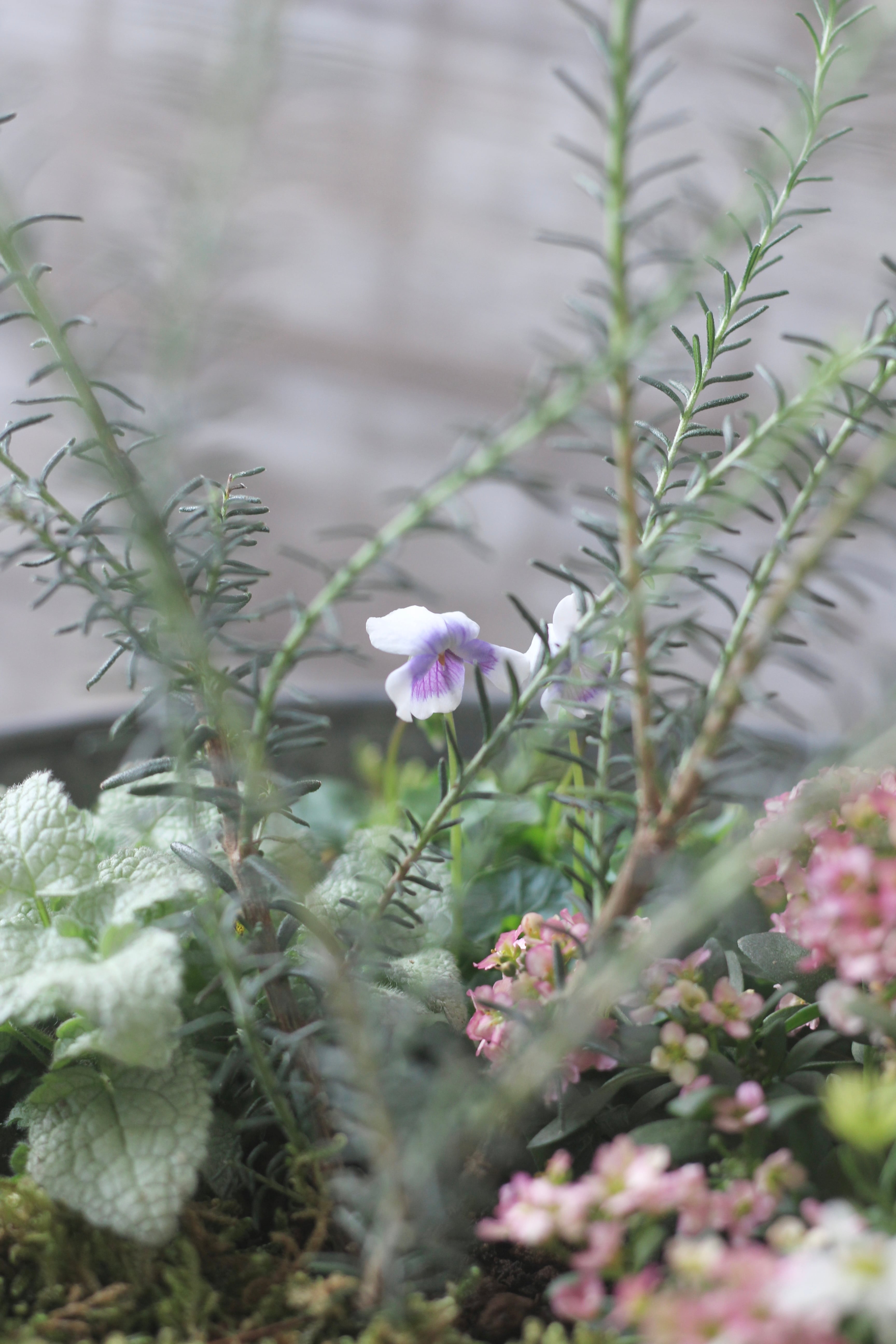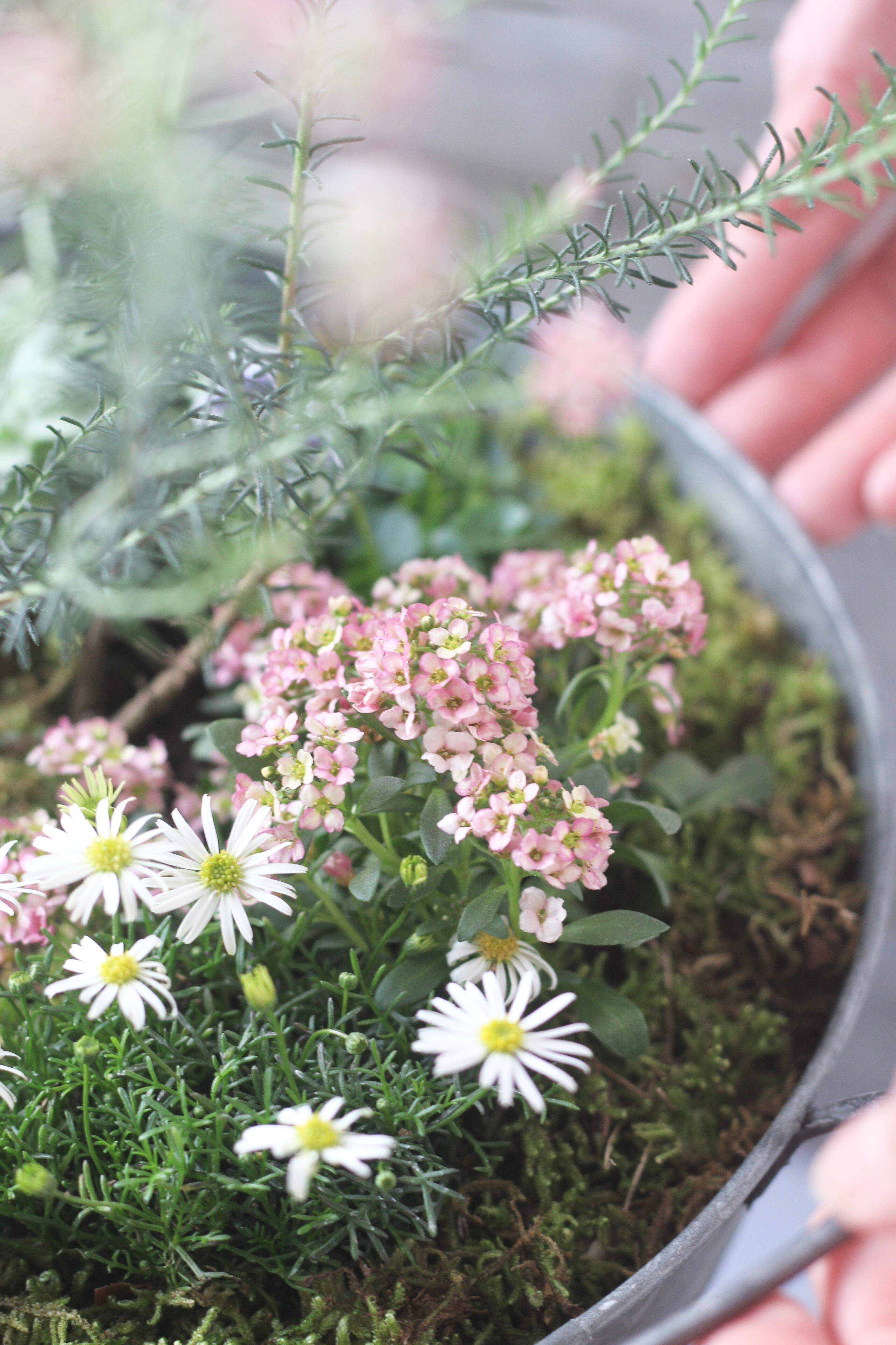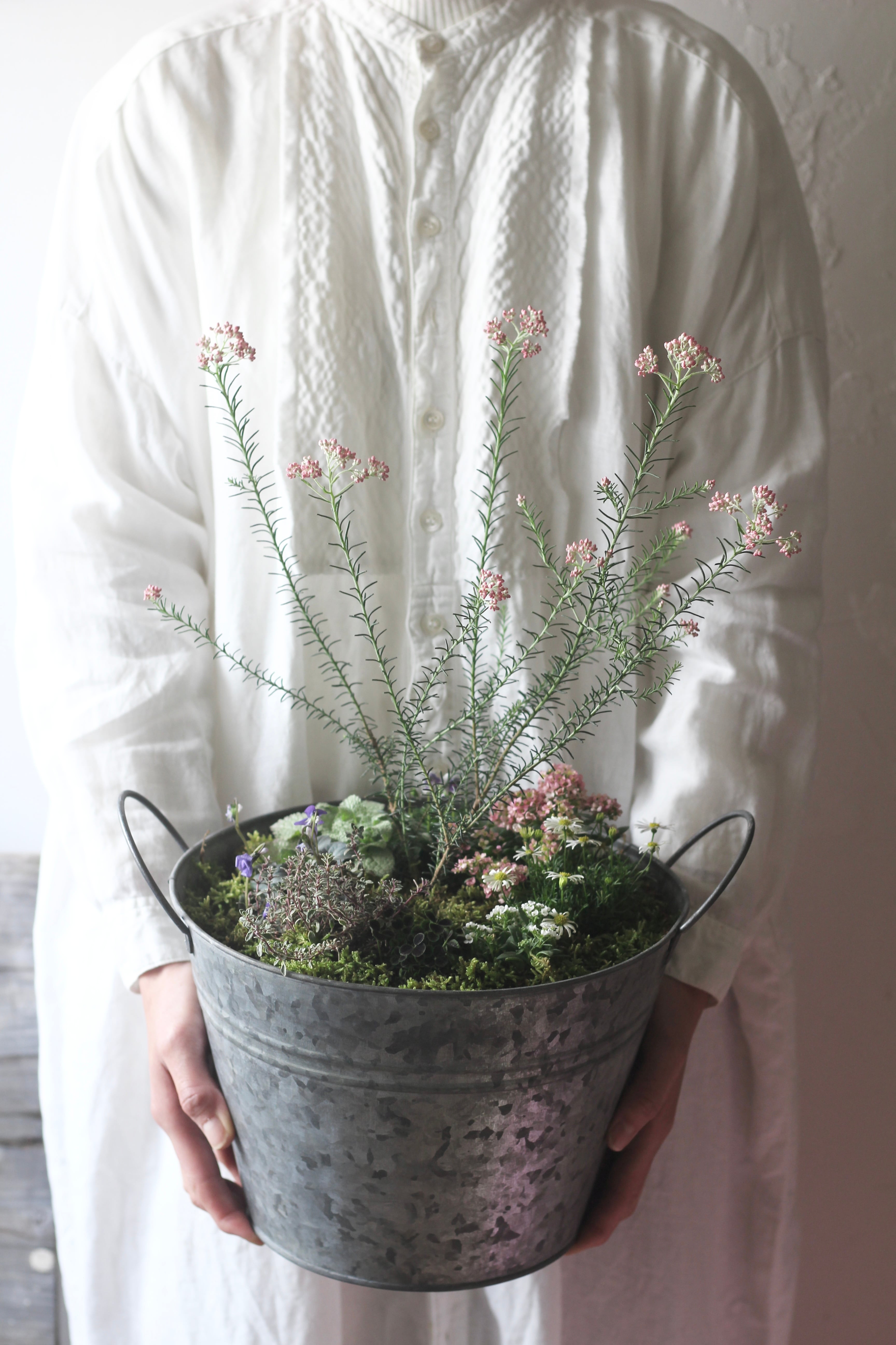 お米のような蕾が可愛らしいところから、名前が付いたライスフラワーをメインに、ブラキカム、パンダスミレなど、9種類の植物をブリキ鉢に植え込みました。